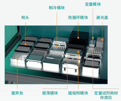 包含20個標準盤位,整合PCR儀、定量模塊,實現建庫過 程中各類酶反應、PCR擴增、文庫定量等自動化操作