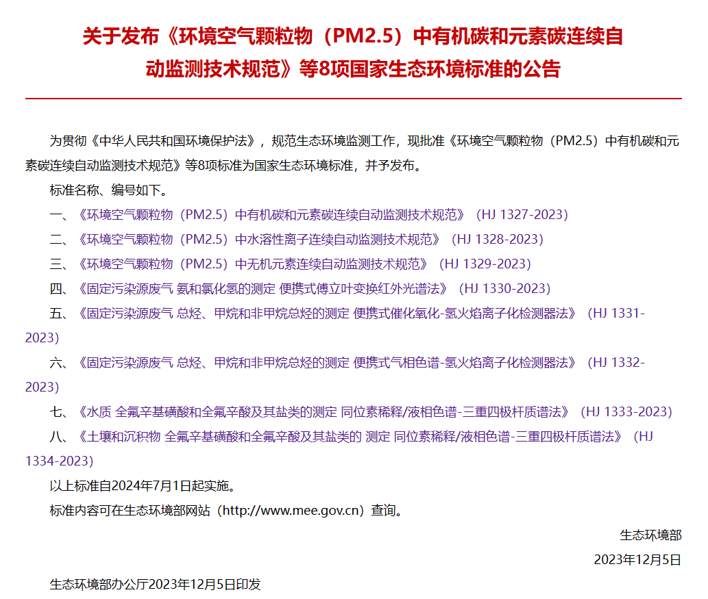 全氟化合物作為一種表面活性劑和保護(hù)劑,自20世紀(jì)50年代開(kāi)始生產(chǎn)以來(lái)被廣泛應(yīng)用于工業(yè)生產(chǎn)和日常用品中,如地毯、皮革、地板蠟等。全氟化合物具有高毒性、持久性、生物累積性和遠(yuǎn)距離遷移性等持久性有機(jī)污染物的特點(diǎn)。2023年3月1日,《重點(diǎn)管控新污染物清單(2023年版)》正式生效,清單包含了全氟辛基磺酸及其鹽類、全氟辛酸及其鹽類等14種類重點(diǎn)管控新污染物。2023年12月5日,生態(tài)環(huán)境部首次發(fā)布HJ 1333-2023《水質(zhì) 全氟辛基磺酸和全氟辛酸及其鹽類測(cè)定 同位素稀釋/液相色譜-三重四極桿質(zhì)譜法》和HJ 1334-2023《土壤和沉積物 全氟辛基磺酸和全氟辛酸及其鹽類的測(cè)定 同位素稀釋/液相色譜-三重四極桿質(zhì)譜法》2項(xiàng)標(biāo)準(zhǔn),為新污染物治理提供支撐。